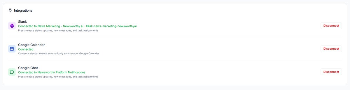 Connect your account to Google Chat, Slack and receive realtime updates on changes to your press release status or other platform messages. Connect your google calendar and when you update your editorial calendar here, it will sync to your Google Calendar.