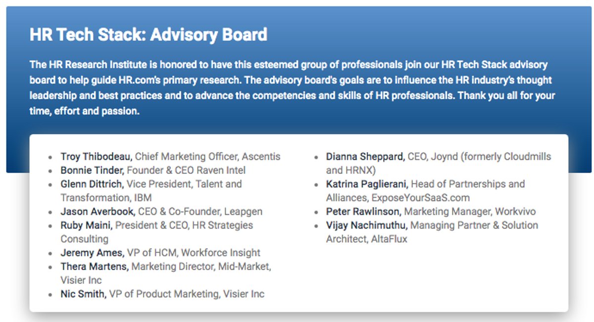 “Working closely with HR.com’s HR Research Institute (HRRI), the newly appointed board of industry experts and thought leaders will counsel on the most impactful topics and key areas within the HR technology space to positively and effectively guide primary research.”