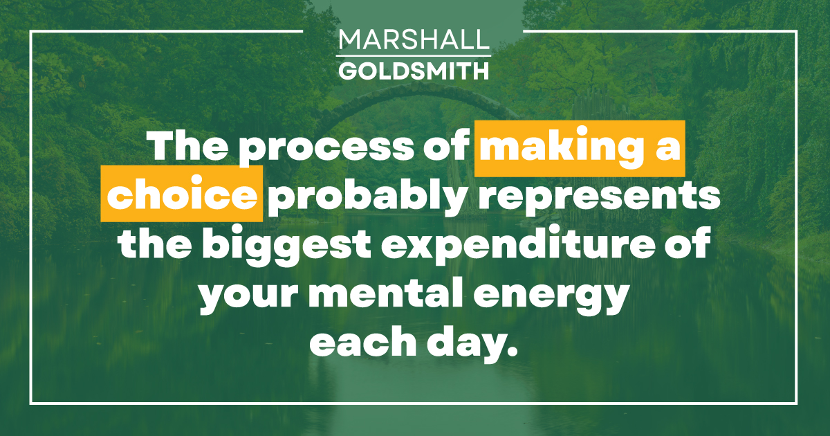 In a blog post related to the difficulty of choice, adapted from his book The Earned Life, the renowned leadership coach and bestselling author Marshall Goldsmith On a purely personal level, choice can seem difficult - and even paralyzing. In a new blog post, Marshall Goldsmith, the renowned leadership expert and bestselling author, talks about this. He writes, “Some people love making choices-CEOs, film directors, and interior designers come to mind. They enjoy the power of giving a thumbs-up or -down to an acquisition, or the length of an actor’s hair, or the specific shade of gray for wall paint. I don’t. Perhaps you don’t either. Yet extensive research shows that the process of making a choice probably represents the biggest expenditure of your mental energy each day-and it leads to depletion, which can ultimately lead to bad decisions.”