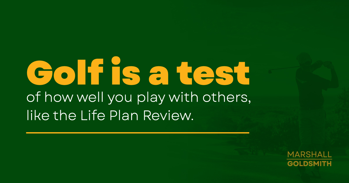 Goldsmith says that a Life Plan Review is a little like golf, in that it is a game built on responsibility. Goldsmith writes: “Golf done right venerates meritocracy and justice. Nothing is given. Everything is earned—the result of practice, maximizing talent, and an urge for constant improvement. It embodies our definition of an earned life because the choices, risks, and efforts we make can be directly linked to an experience we value, regardless of our score. If you replace the word golf with the term Life Plan Review, you have all the reasons to adopt it and make it a group exercise.”