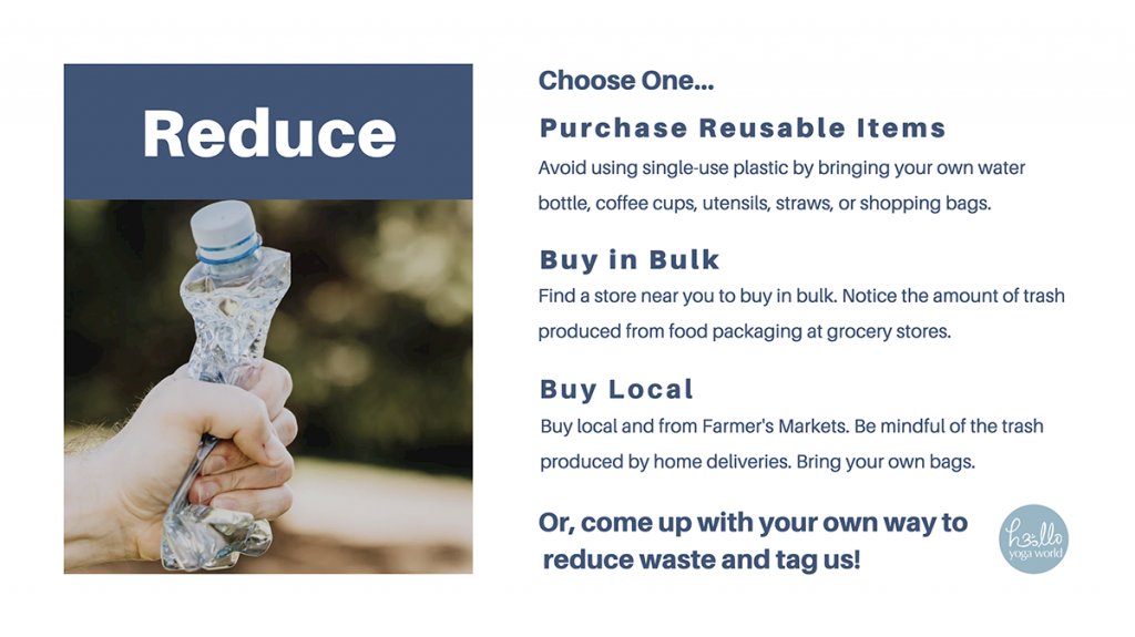Part of the HelloYogaWorld mission is to regenerate Mother Earth. Every month, a Call to Action theme is chosen by HelloYogaWorld members. The current theme is to reduce the production of unnecessary trash and consumption.