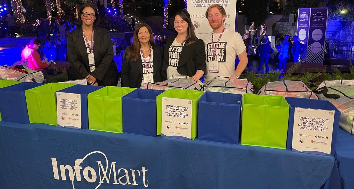 InfoMart, a leading global background check company, has taken the first step in its Pledge 1% commitment by organizing a kit-building drive for Nashville’s Sexual Assault Center at the 2023 WBENC National Conference. Fellow women-owned companies Improve Growth, Innolect, Prelude Solutions, and Spirit Sox USA donated to the event. WBENC’s attendees bundled these donations into backpacks that were then donated to SAC.