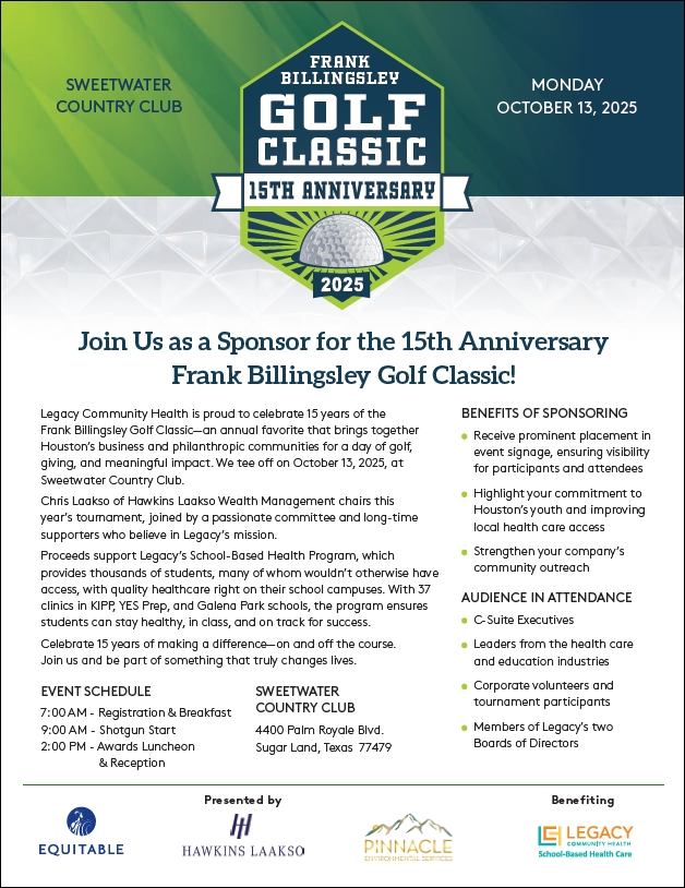 Legacy Community Health is excited to announce the 15th Annual Frank Billingsley Golf Classic, presented by Equitable, Hawkins Laakso Wealth Management, and Pinnacle Environmental Services. The event is set to take place on October 13, 2025, at the prestigious Sweetwater Country Club in Sugar Land.