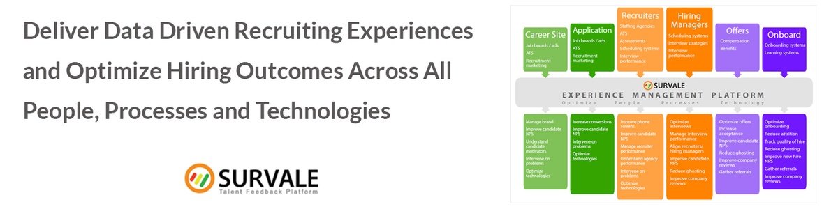 Survale is the provider of an "Always-On" talent feedback platform that automatically gathers, analyzes, and reports on satisfaction and engagement data from candidates and employees from "hello to hire to retire." Survale's prescriptive analytics enable companies to optimize their talent-facing programs, pinpoint problems with people, processes, and technologies, and increase quality of hire, offer acceptance, and employee retention.