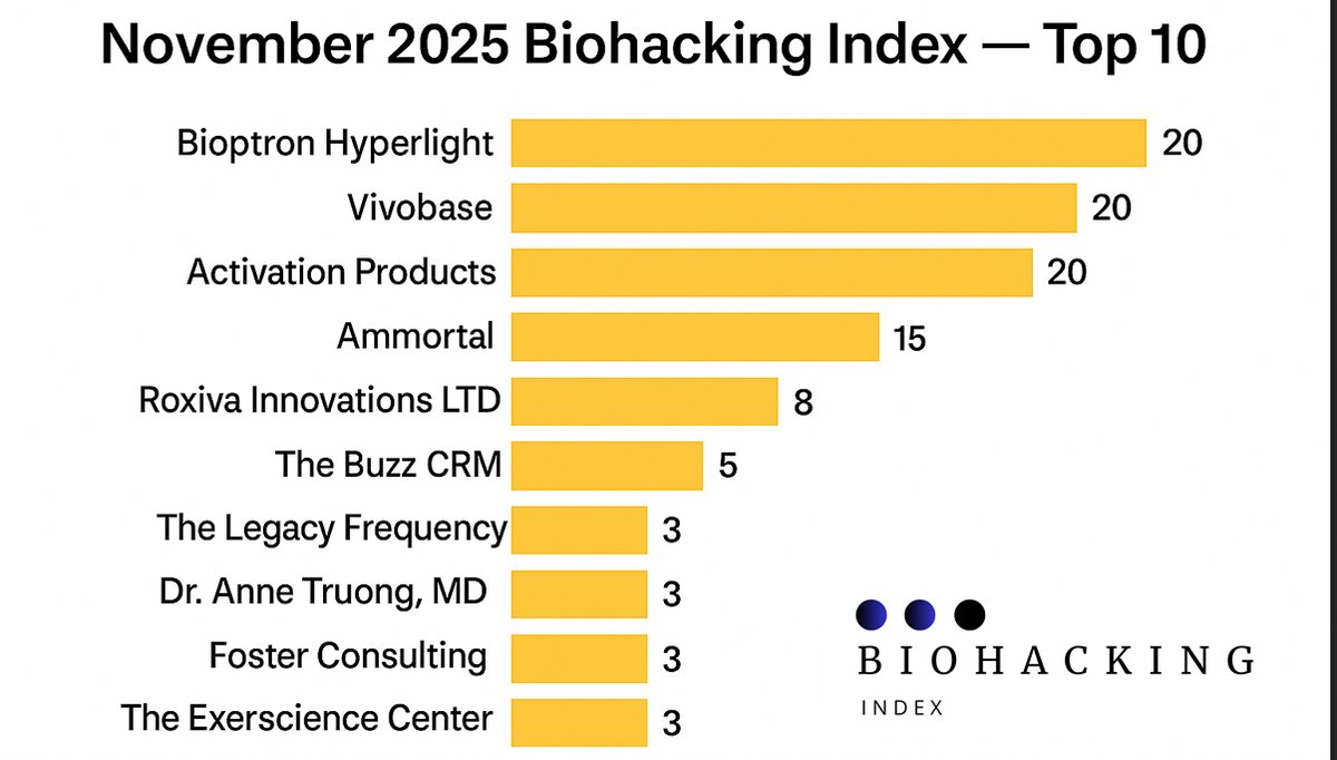Unlike October’s curated list, the November report reflects pure community-driven results, based on verified feedback from practitioners, operators, and consumers across the Biohacking Index platform.