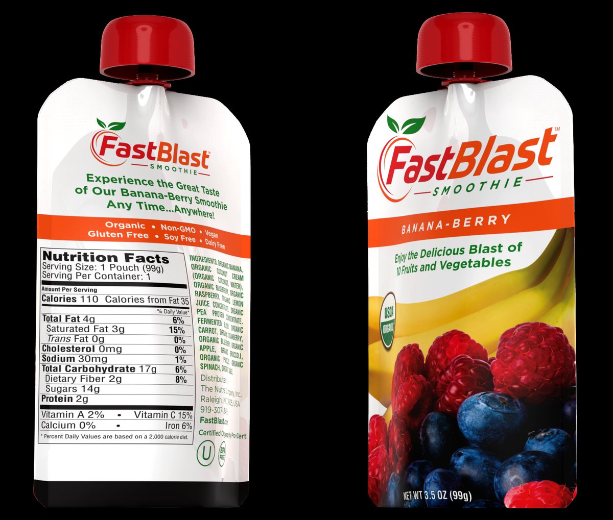 The FastBlast Banana-Berry Smoothie is an organic, vegan product made with fruits, vegetables, and superfoods, and contains no added sugar, with natural sweetness derived from banana, blueberries, and raspberries. Each 3.5-ounce (99g) pouch delivers a balanced combination of protein, carbohydrates, healthy fats, and fiber in a convenient, ready-to-use format.